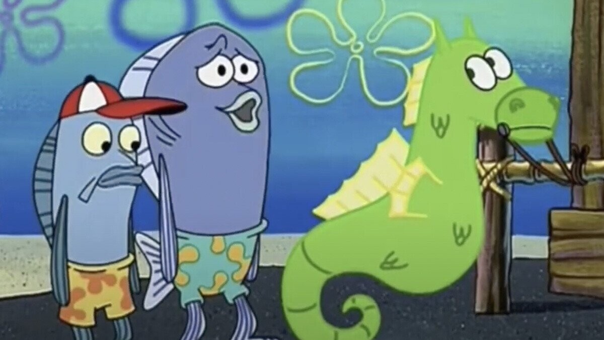 After SpongeBob ties up his seahorse, Mystery, outside of the Krusty Krab, a couple of local yokels mistake the horse for a kids’ ride. When one of them finds Mystery’s “coin slot,” the seahorse kicks them over the horizon, where they explode into a mushroom cloud. An adult joke hidden in a kids’ cartoon, distracting you from filthy humor with explosions — this is why humans started making cartoons in the first place.