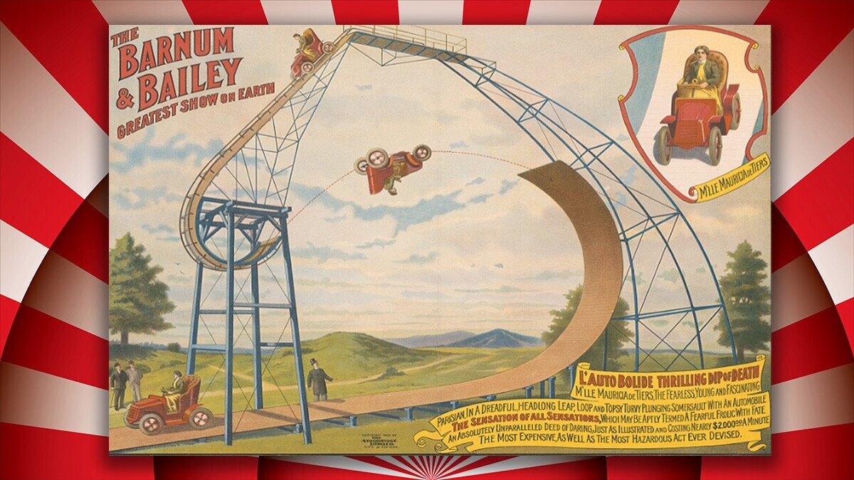 In 1905, Barnum & Bailey’s circus showed off a special driving stunt. A French performer, Mauricia de Tiers, rode a car along the track pictured below, doing a loop-the-loop then gliding through the air before hitting a ramp. It all went well, until the car missed the ramp and crashed one day, killing her.