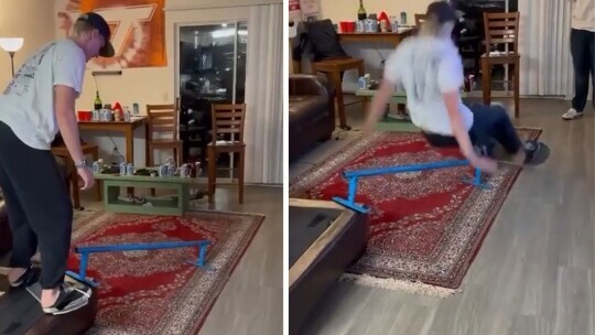 Improvised skateboarding in living room.
